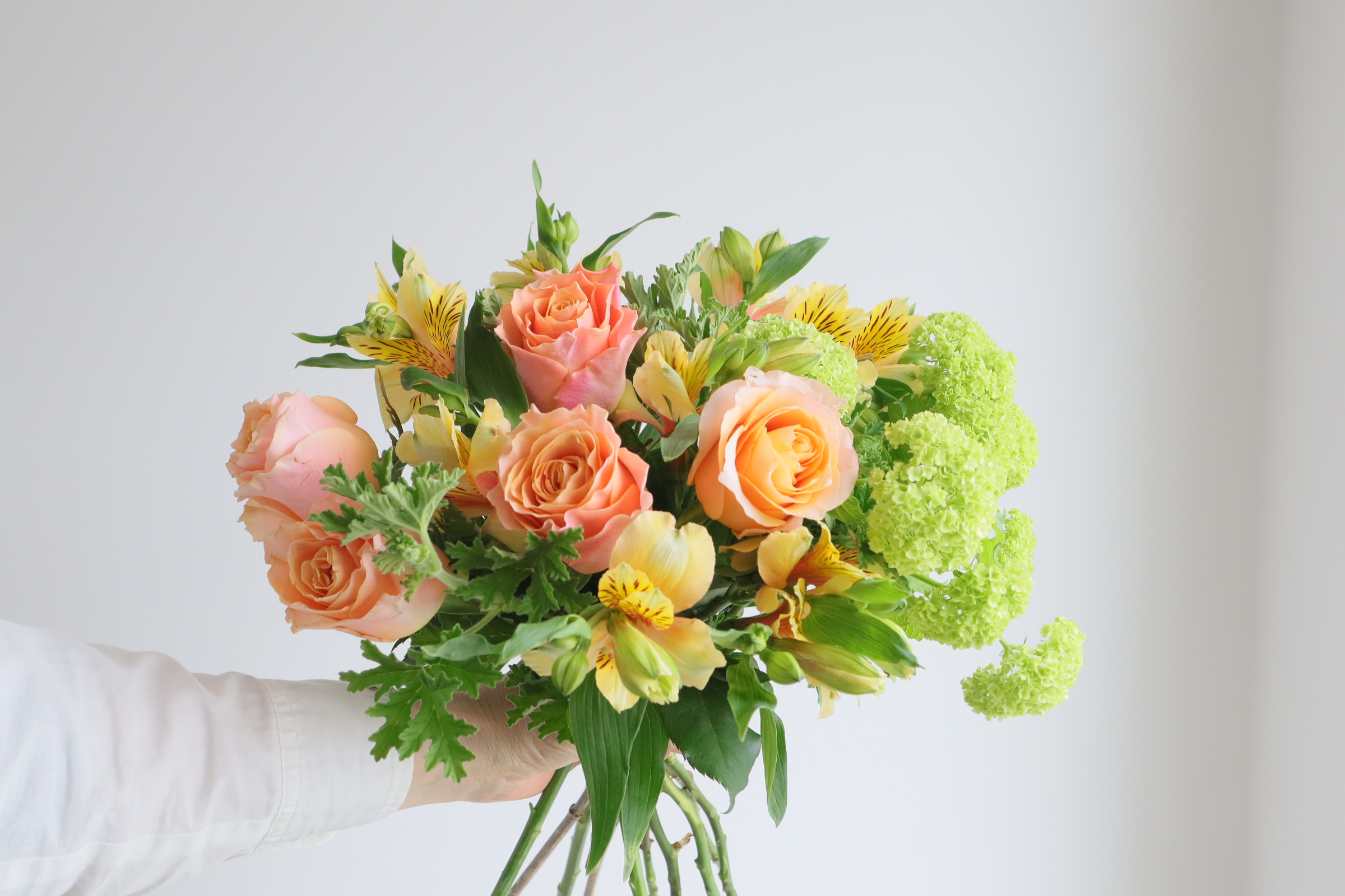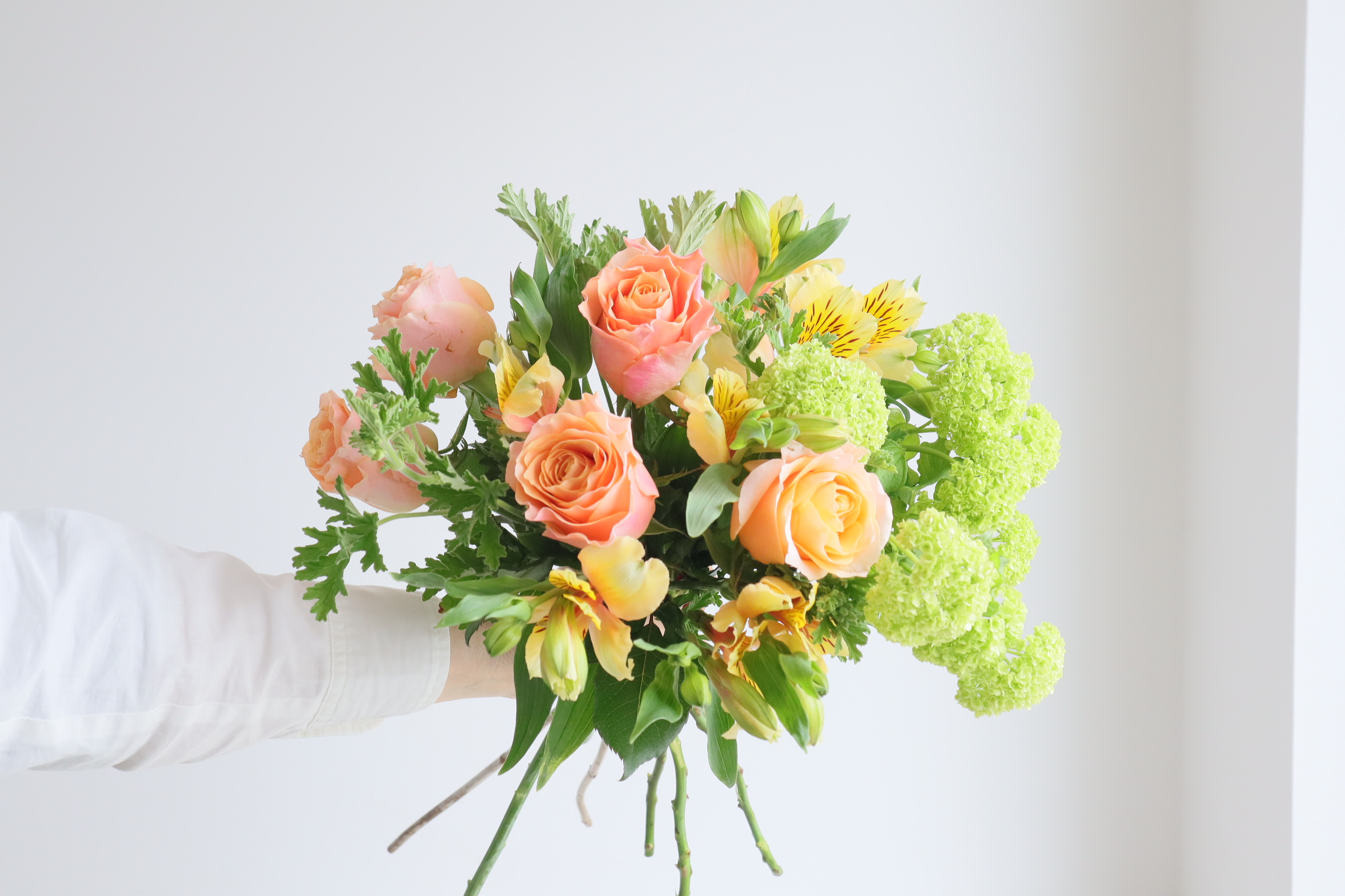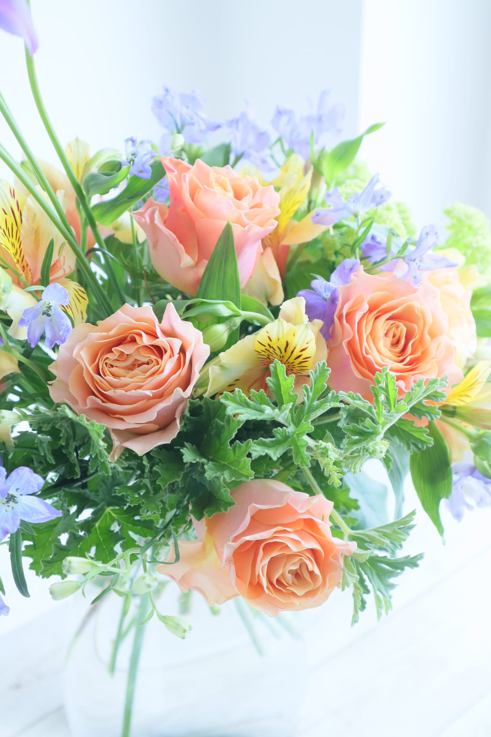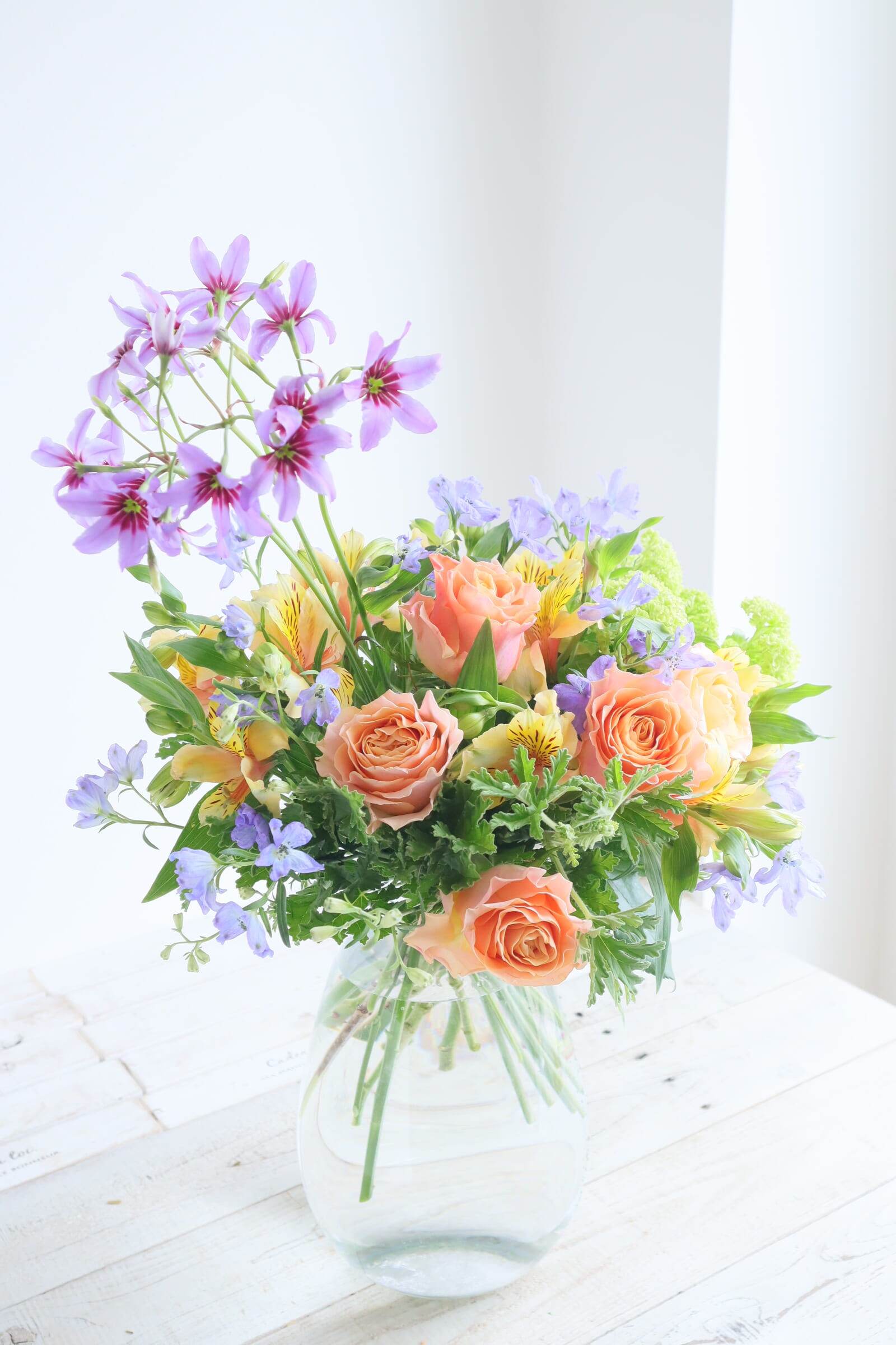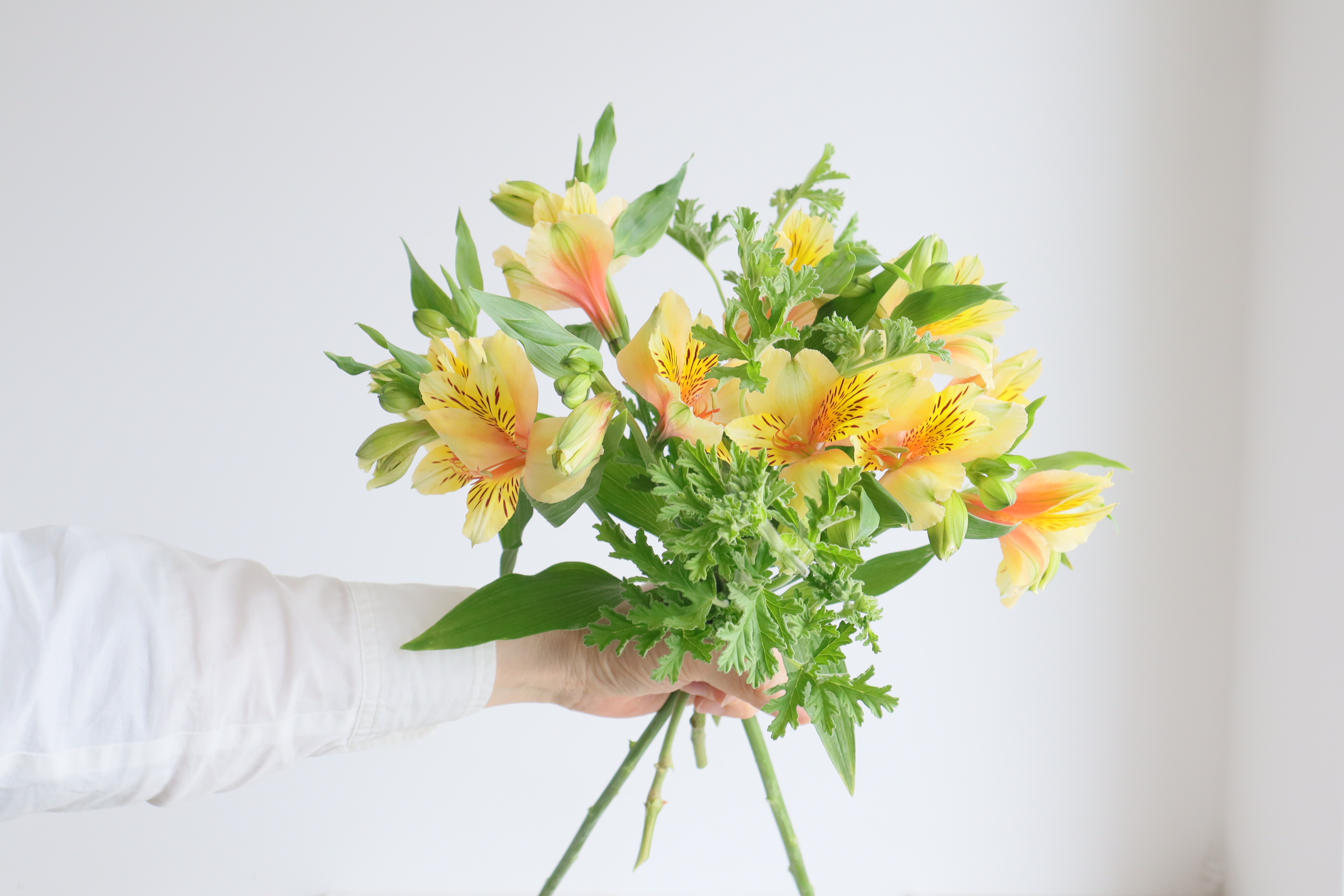 近藤先生「左から ローズゼラニウム、 バラのカルピデューム(オレンジ)、 グリーンのスノーボール、 紫のリューココリーネとデルフィニューム、 黄色のアルストロメリアです。」