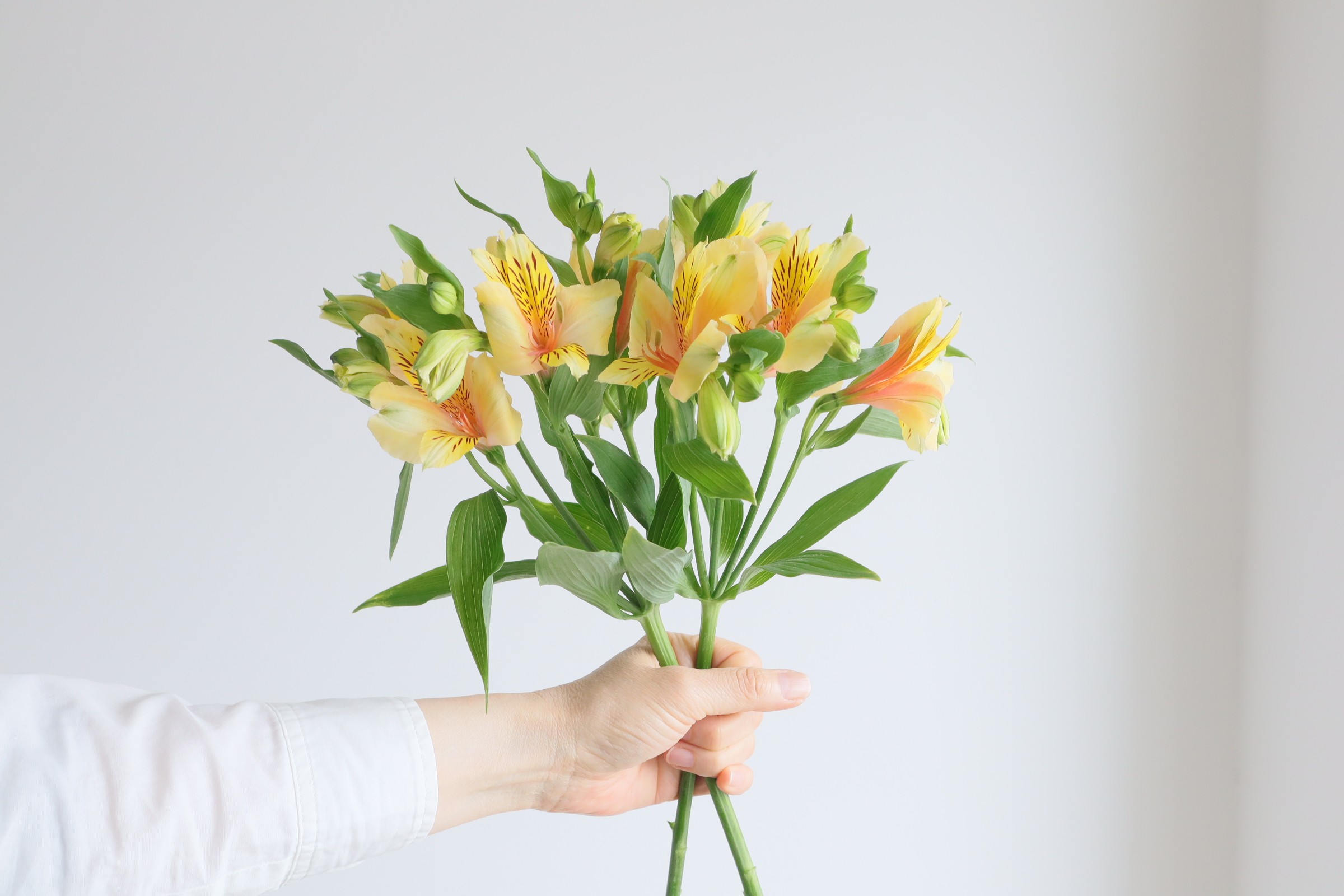 近藤先生「アルストロメリアを中心に持ちます。 クッション花材となり作りやすいかと思います。」