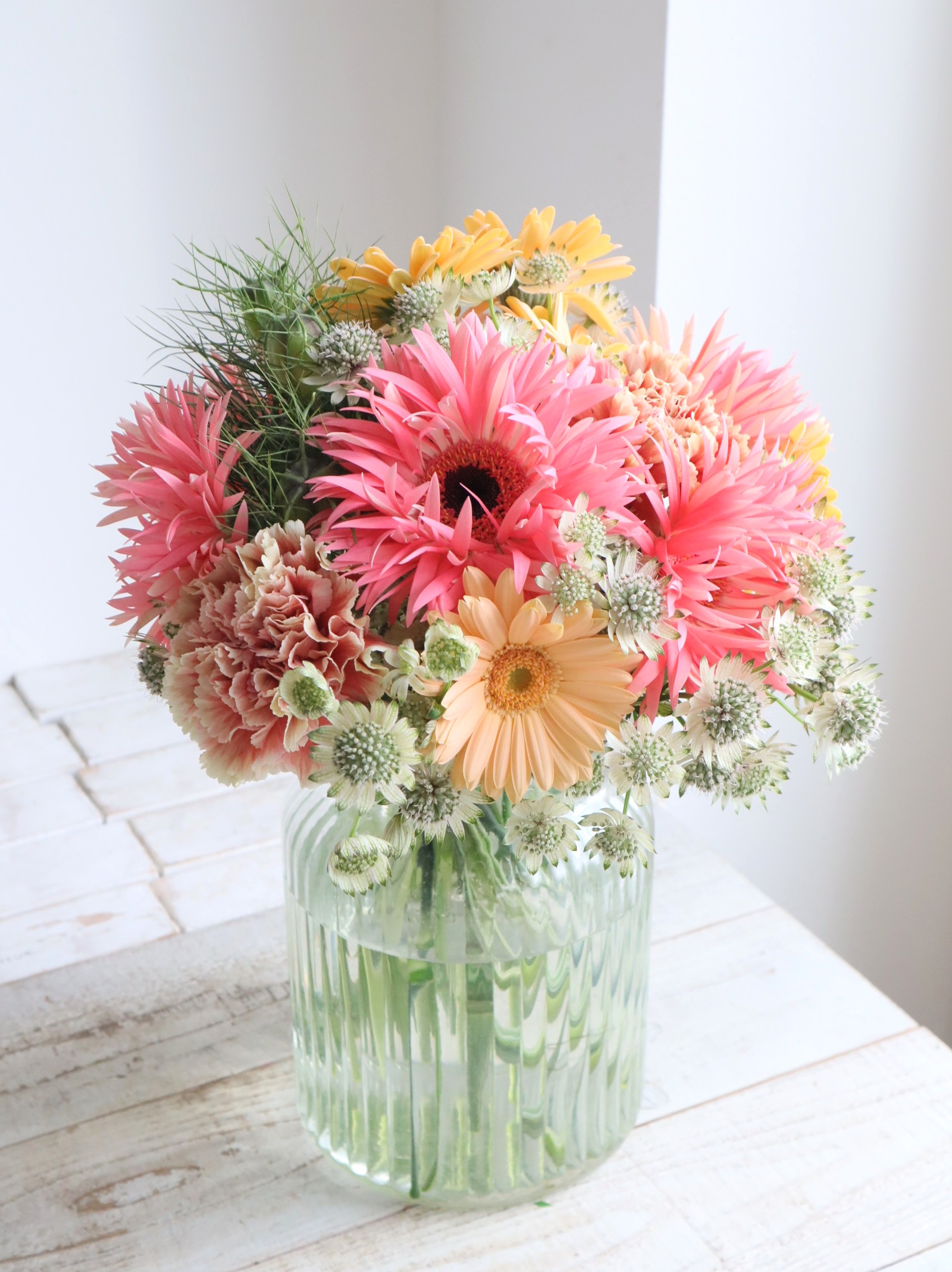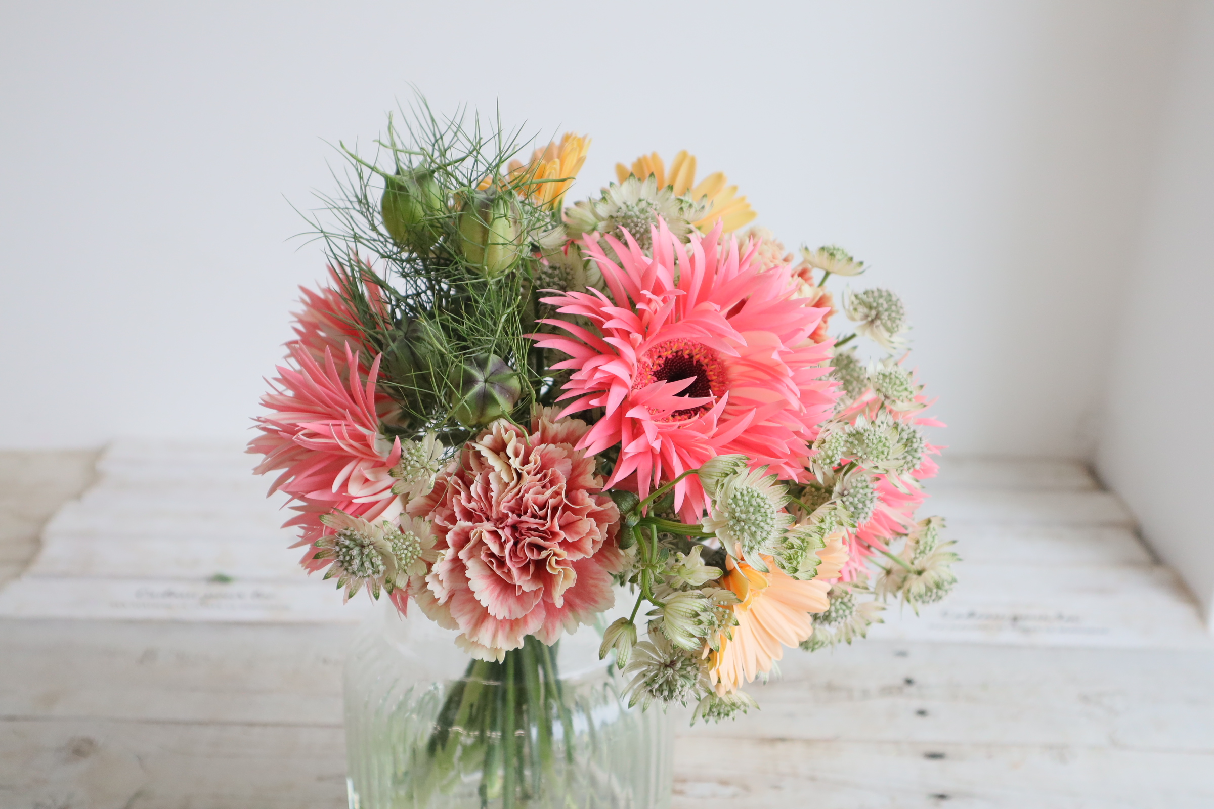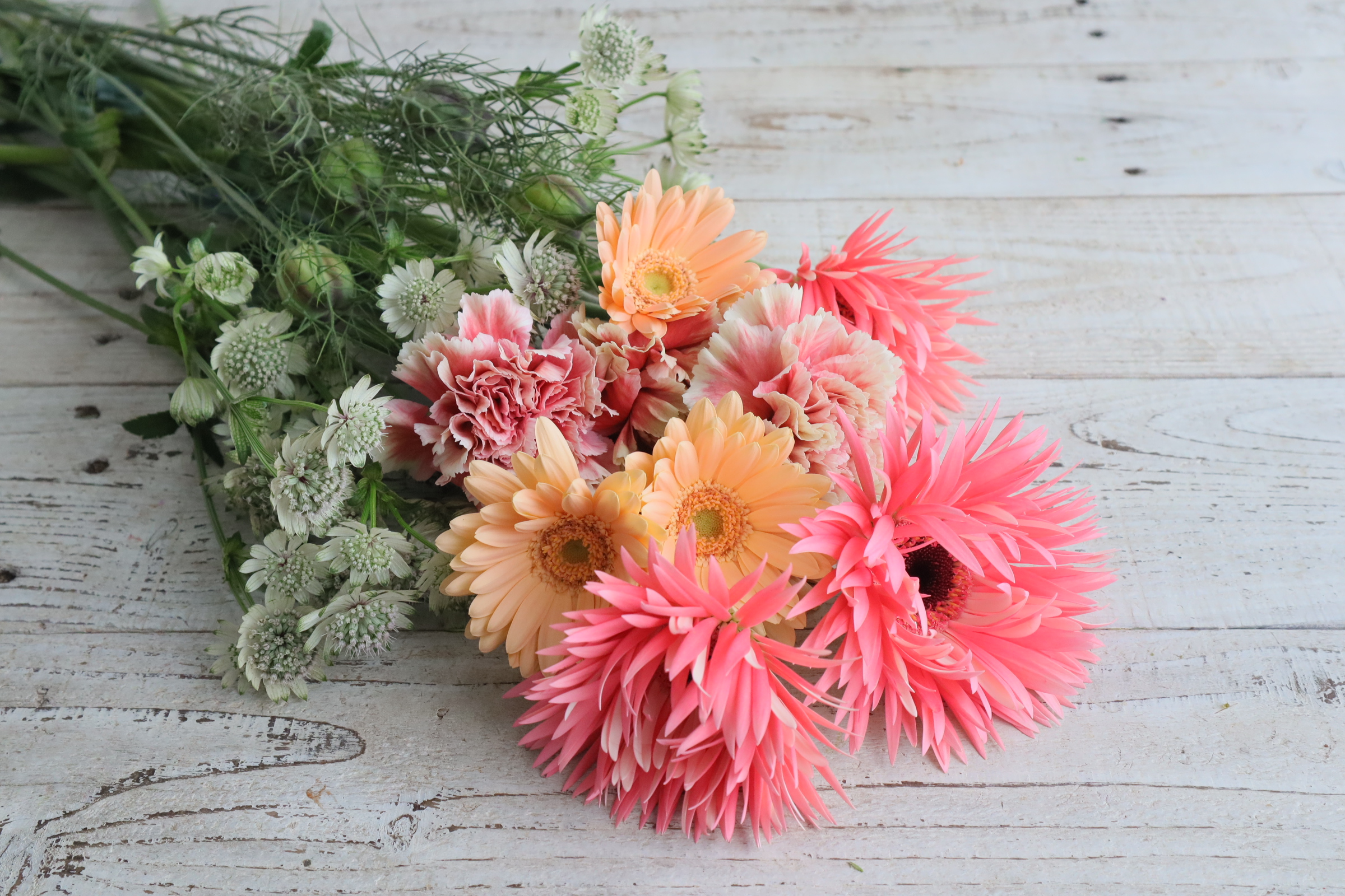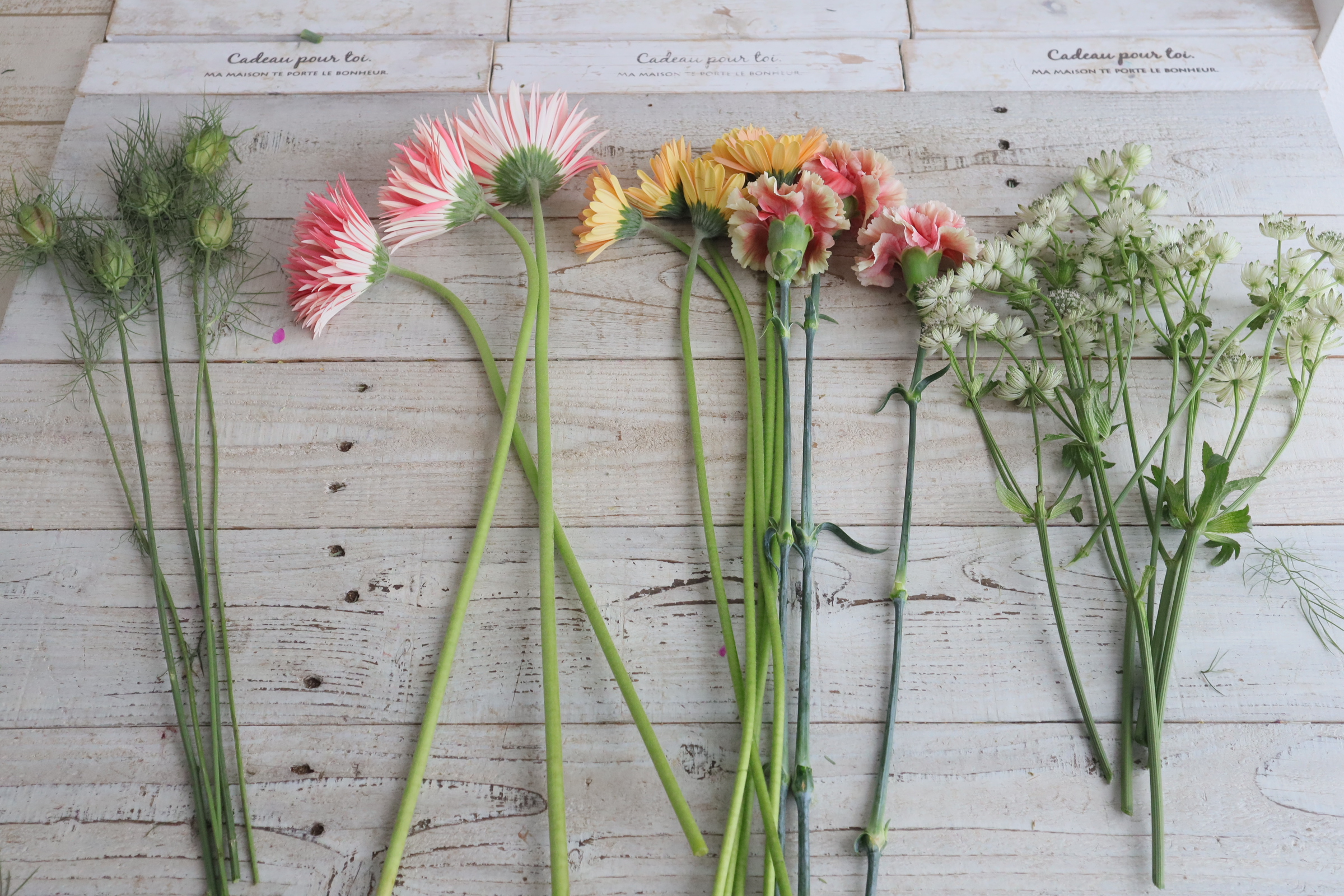 近藤先生「左から 白いアストランチア、 カラフルなガーベラとカーネーション、 上の方にある実の形のニゲラの実。」