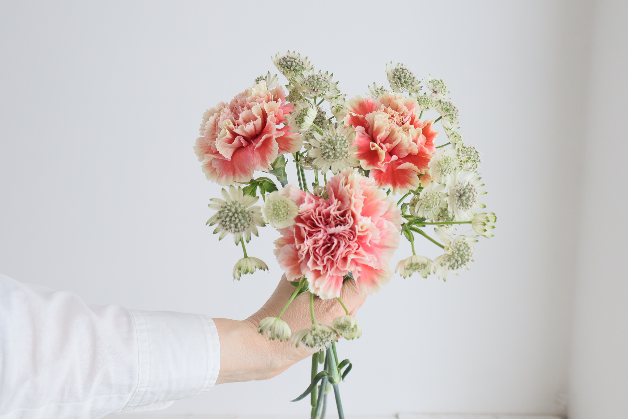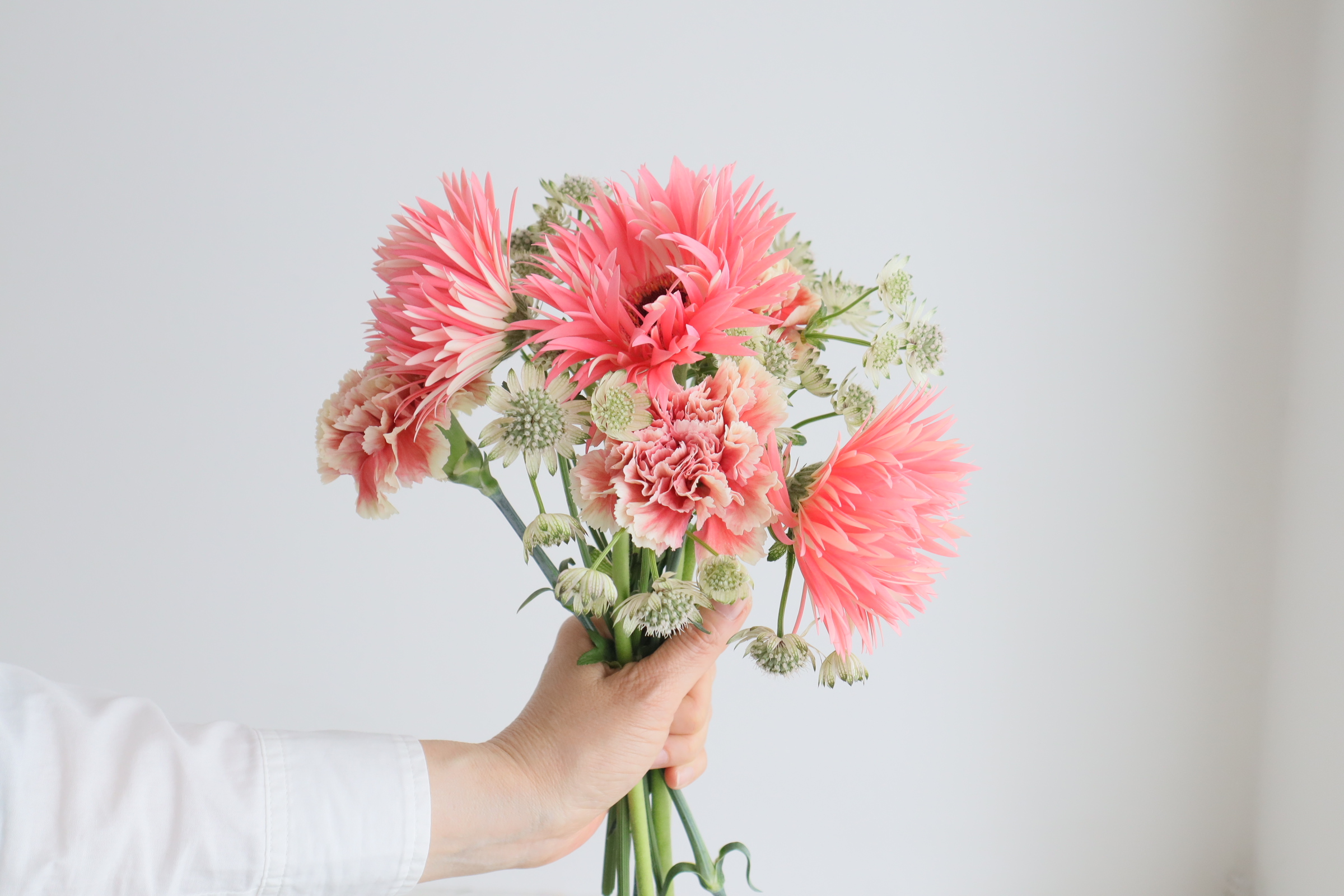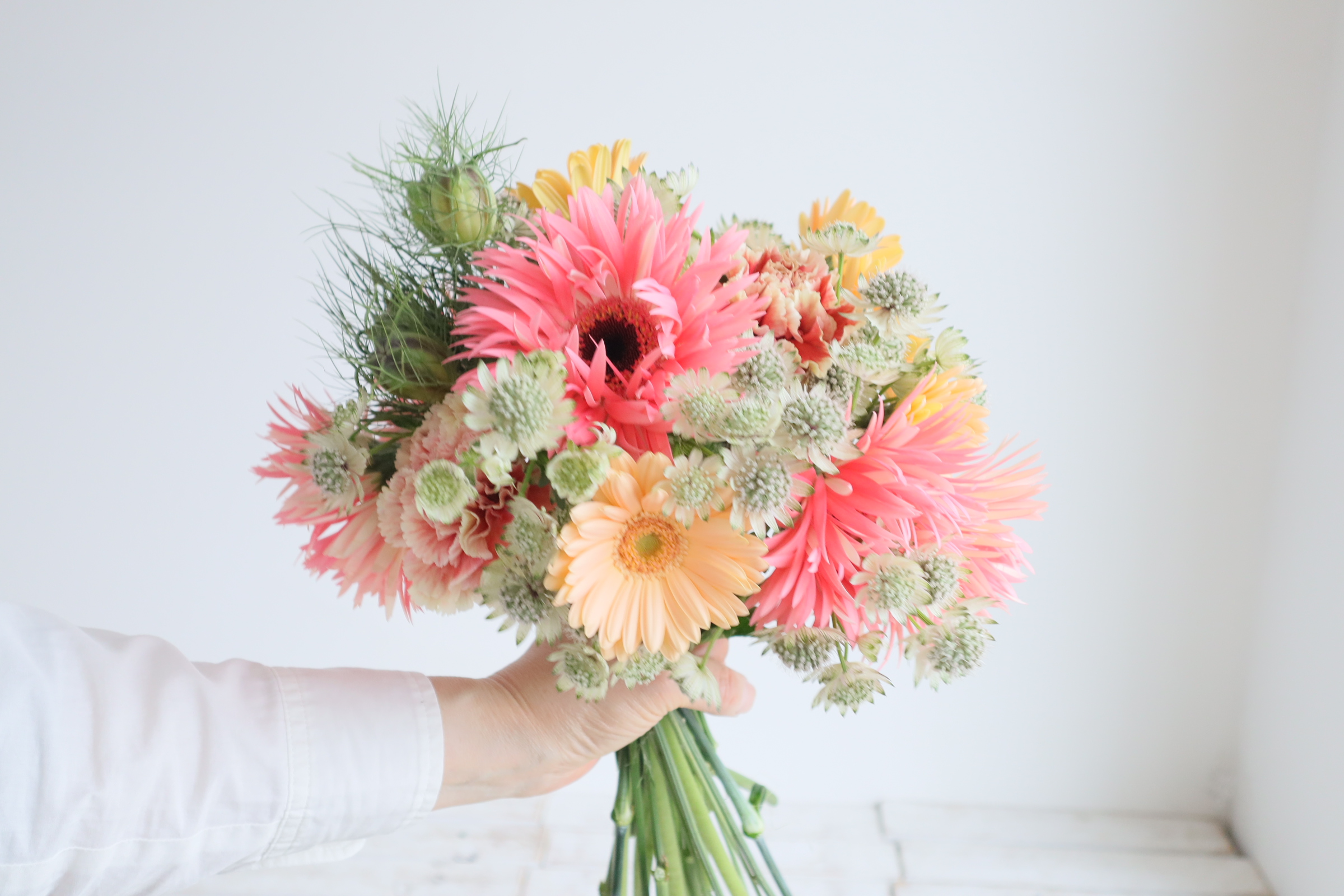 近藤先生「ガーベラの花首が留まりにくいので、アストランチアとカーネーションで支えるイメージで入れます。」
