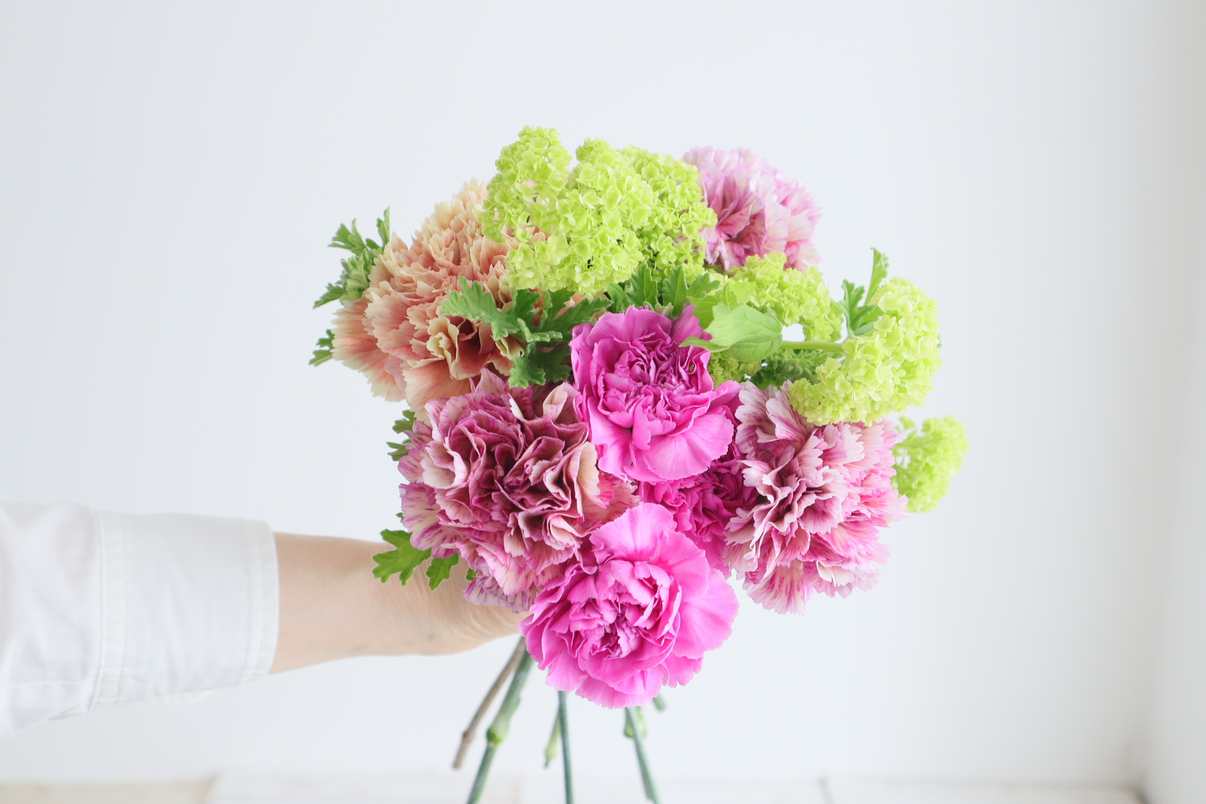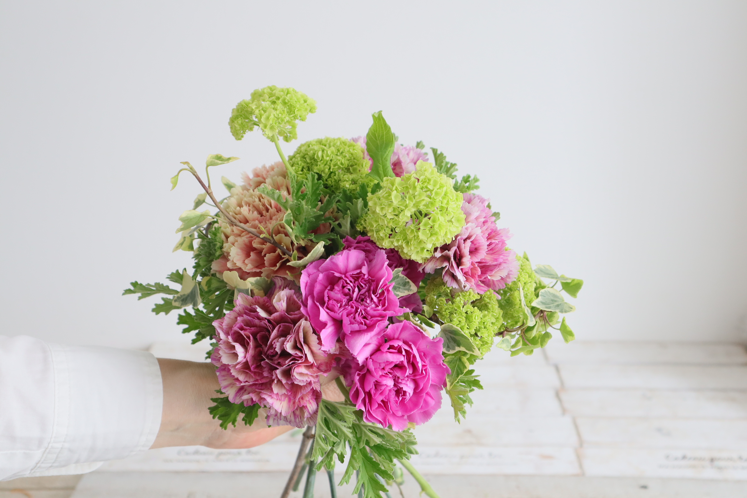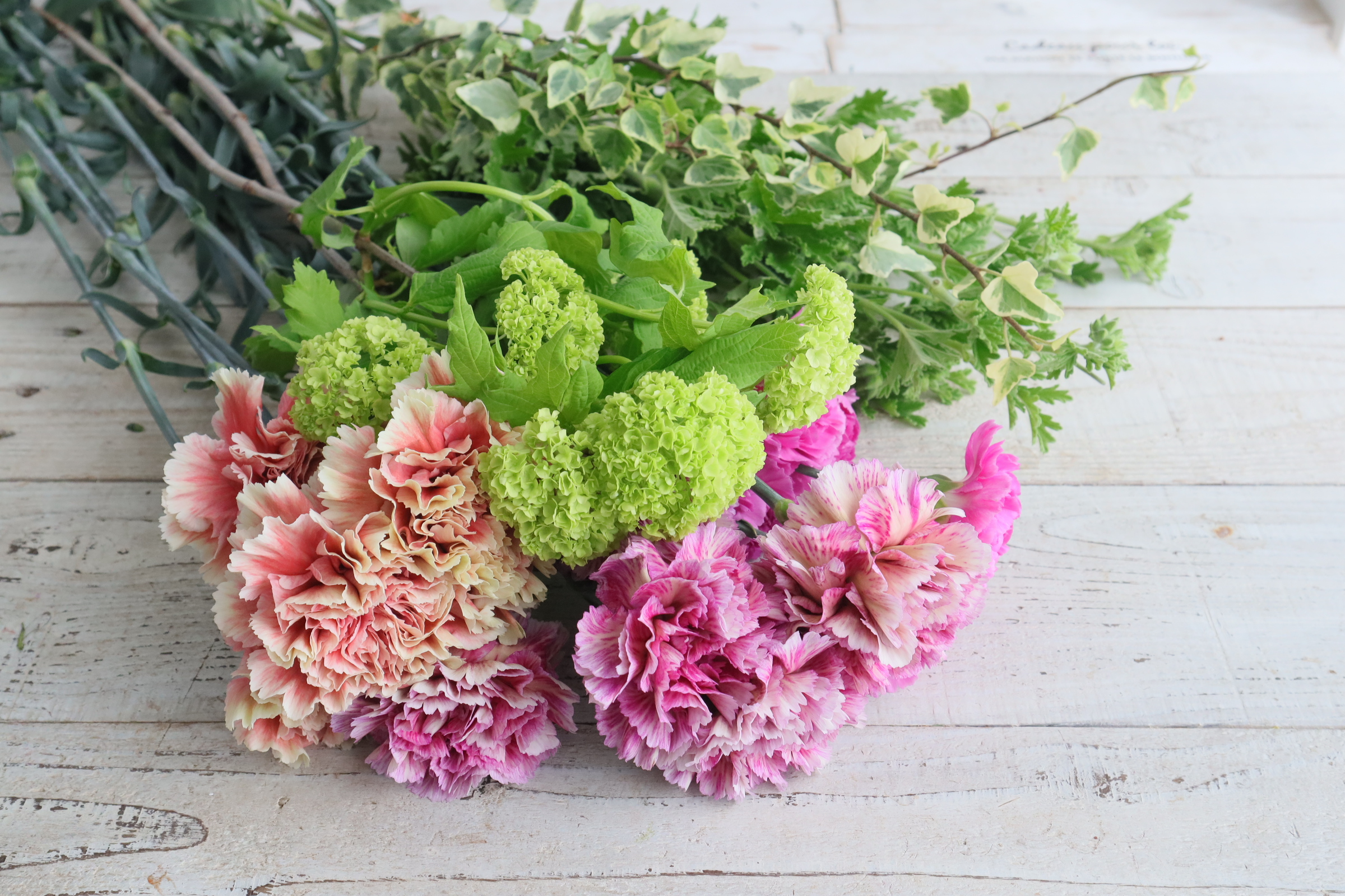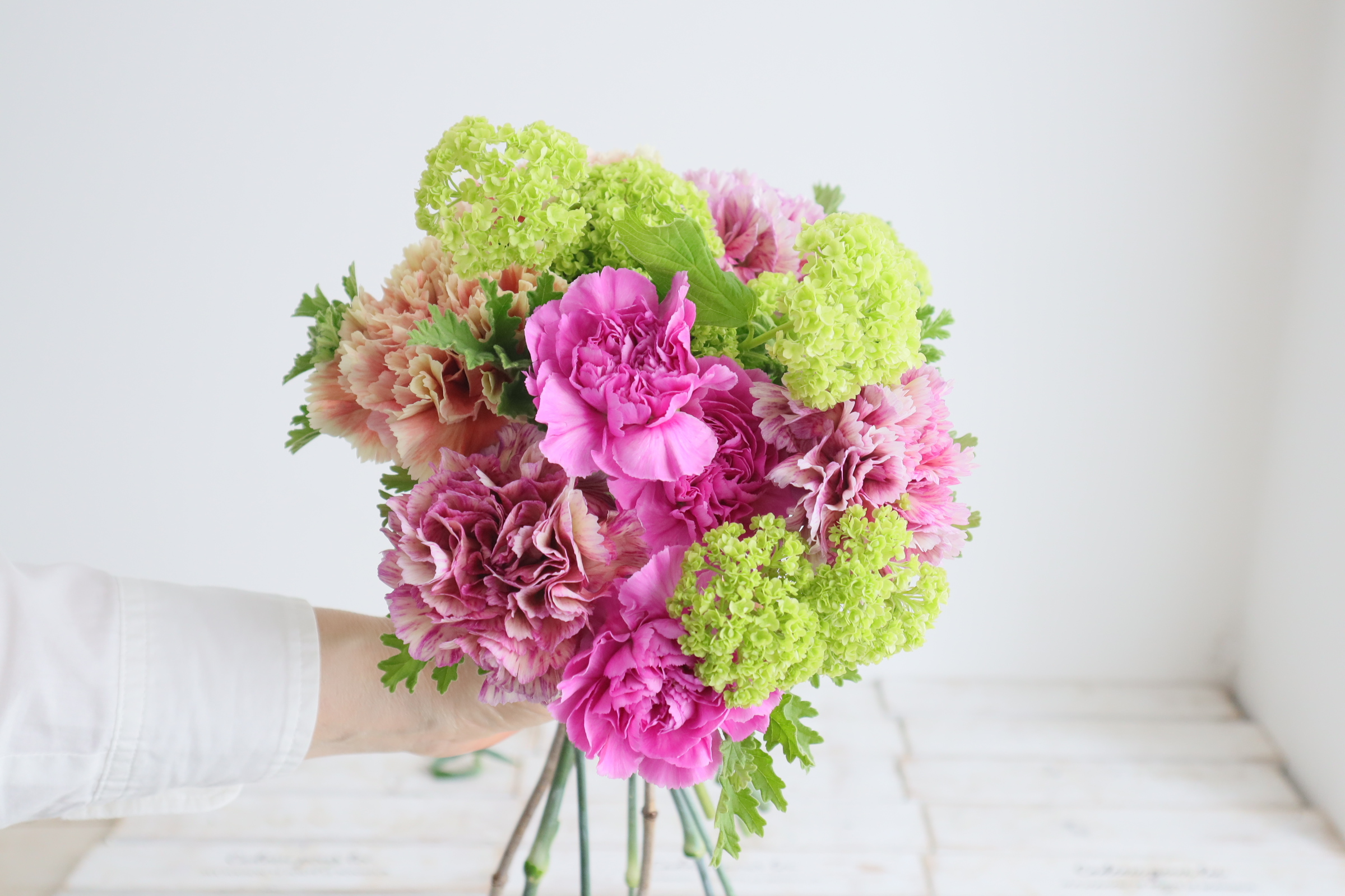 母の日 レッスン/『カーネーションとビバーナムで春色ハーモニーの花束』の作り方