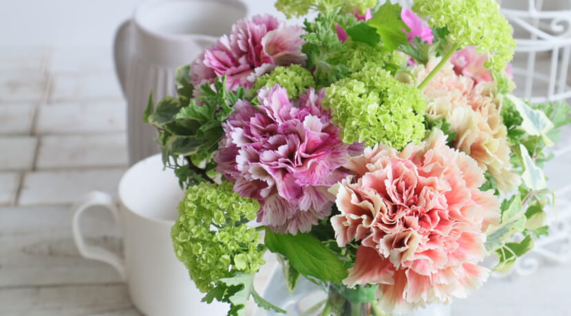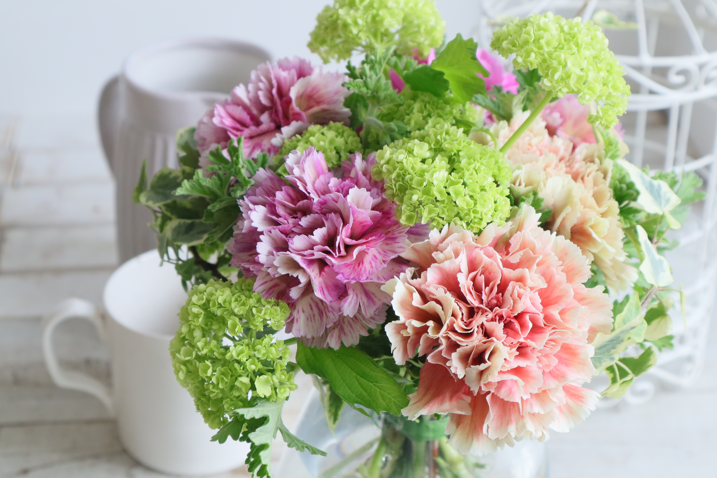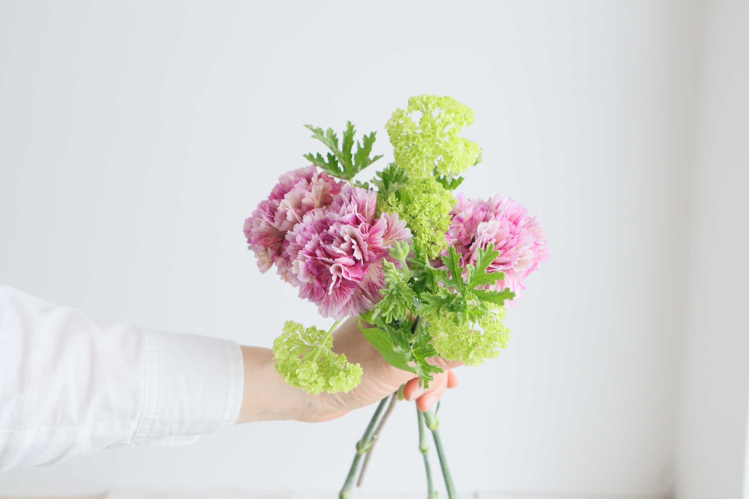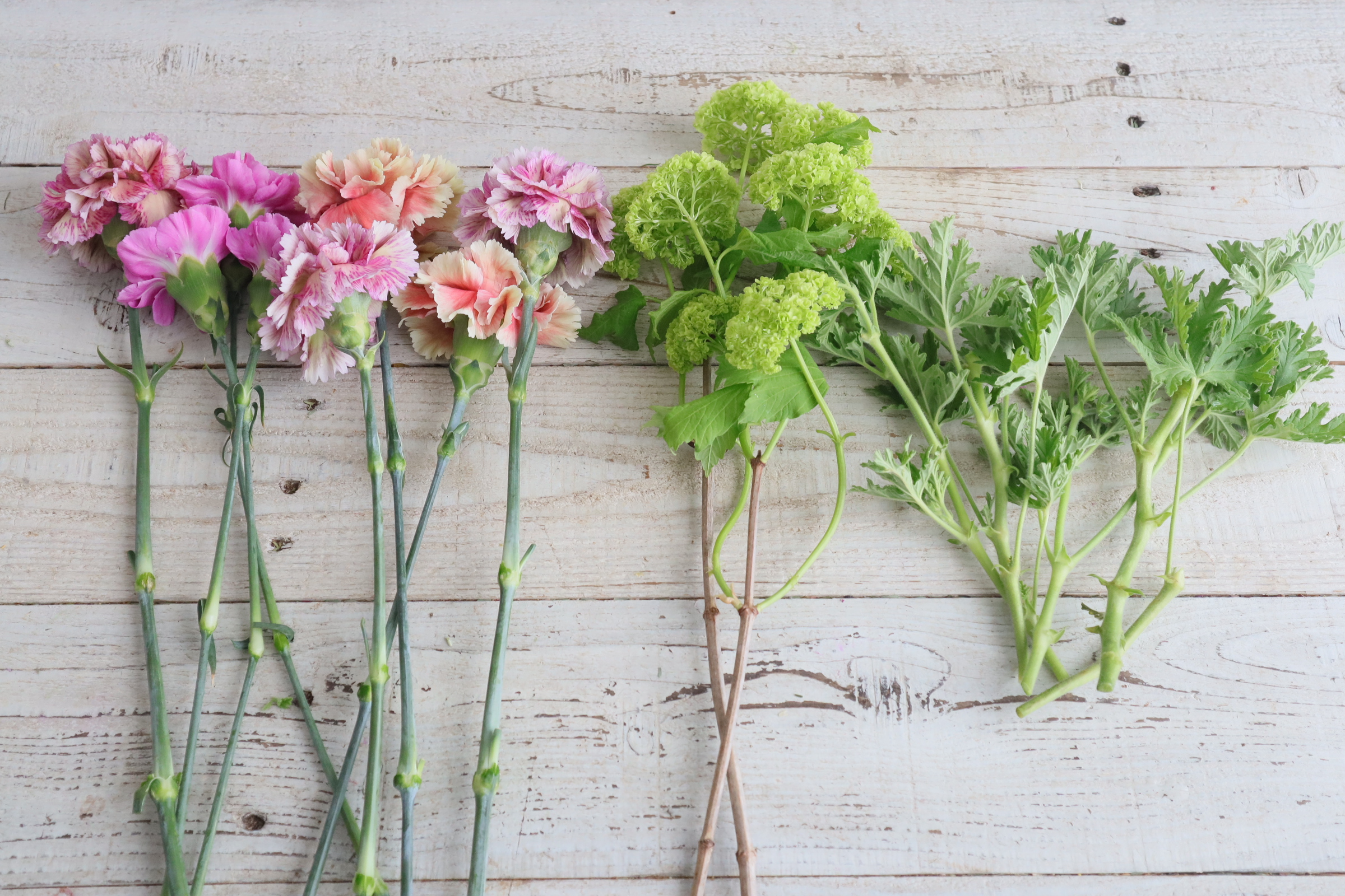 母の日 レッスン/『カーネーションとビバーナムで春色ハーモニーの花束』の作り方