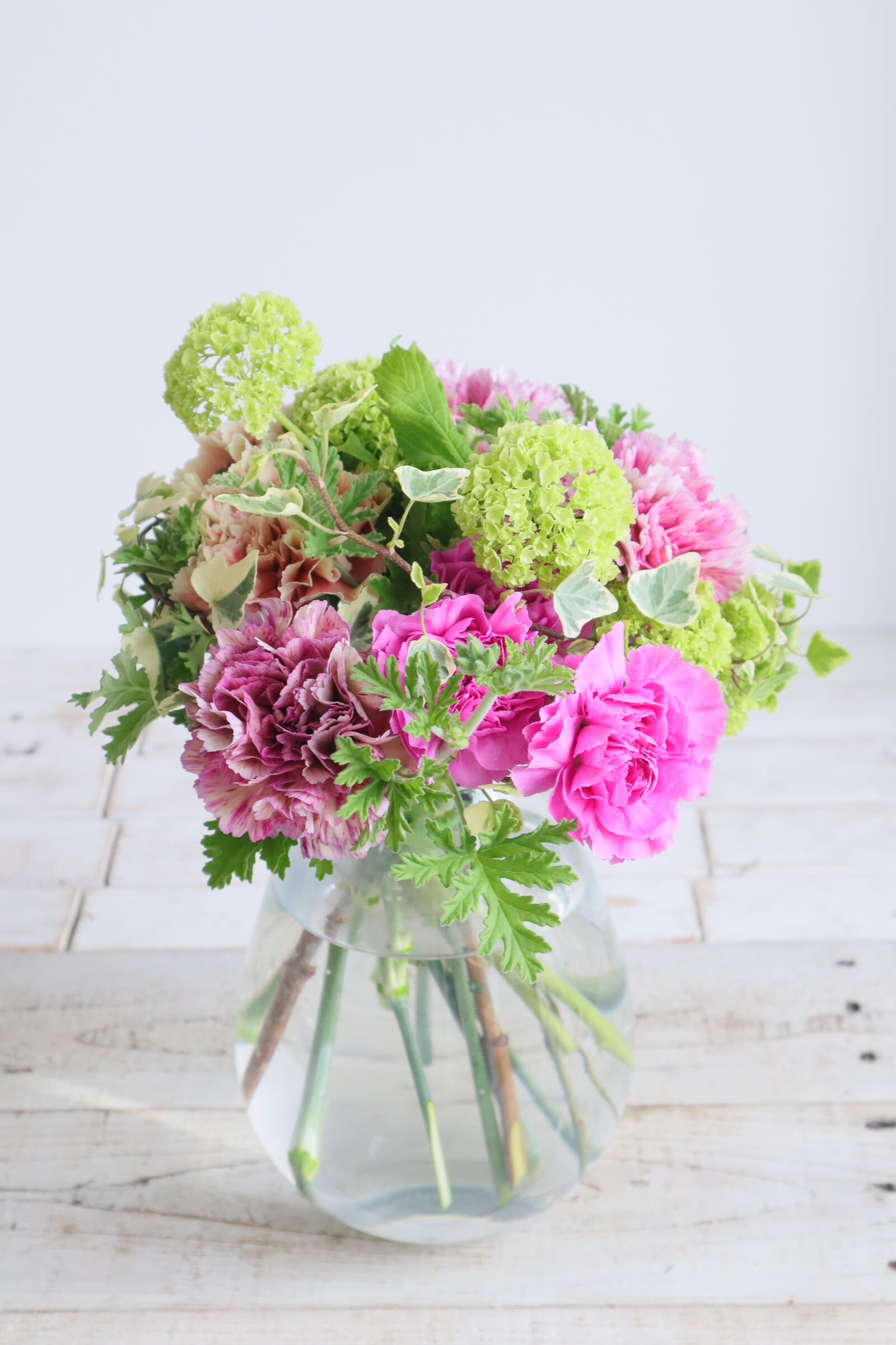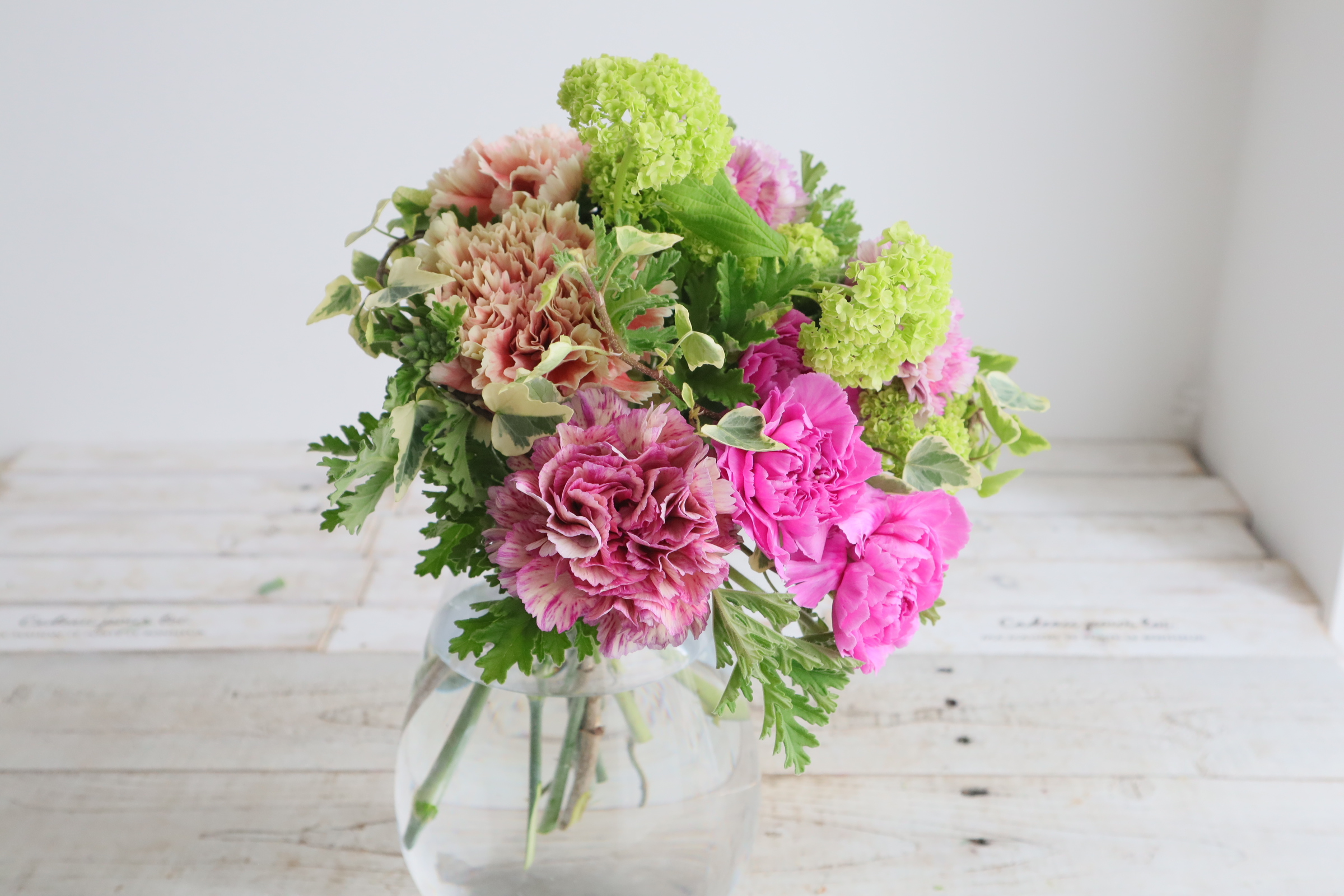 やさしいピンクのカーネーションとライムグリーンのビバーナムに、深みのある紫のカーネーションが織りなす春色のハーモニーで、母の日にもいかがでしょうか。