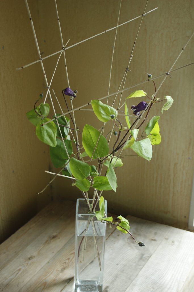 生垣に生えているようなイメージでクレマチスを絡ませて活けます。