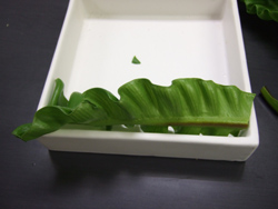 この時点では、はみ出た葉は器に合わせてカットしたほうがいい。なんて、わからずやっていたので、にょろにょろでてます。。。 裏表があるのでそろえていれます。