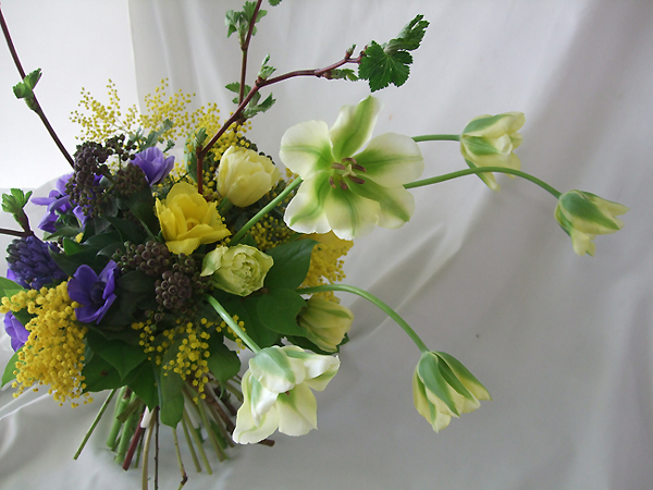 八重チューリップのベロナは短めに。 ヒヤシンス、アネモネも短めにいれました。