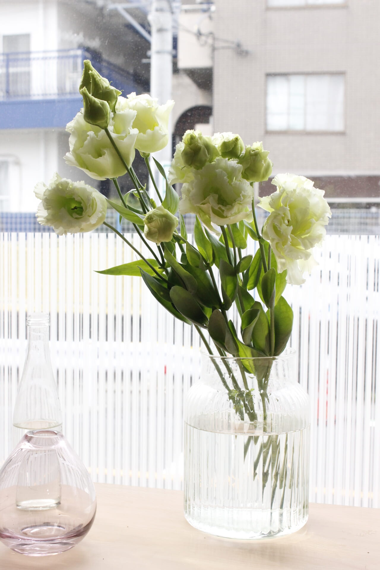 ↓トルコ桔梗(1本に3輪ついてました)を2本、切り分けて小瓶に飾りました。