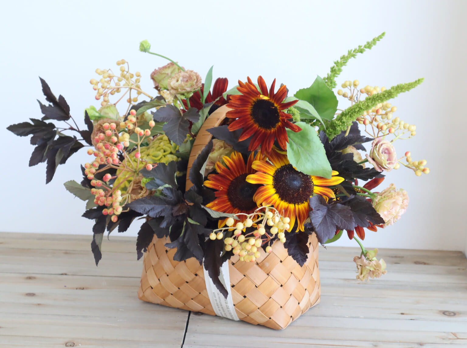夏の定番ひまわりとの相性もよく、ハーブは香りも楽しむことができるものが多くあります。秋のアレンジメントは実りをイメージ