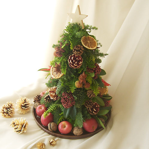 クリスマスにはとても人気です。コーン型フォームなどを使って簡単につくれます。小さなツリー型アレンジメントを楽しめます。壁掛けや壁際に置く時におすすめのフェイシングタイプ
