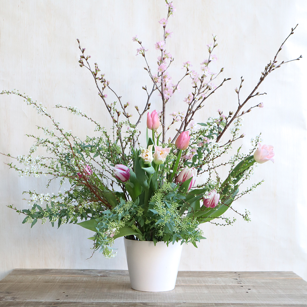 チューリップや桜など、春にしか無いお花をたっぷりと使ったアレンジメントはいかがでしょうか。