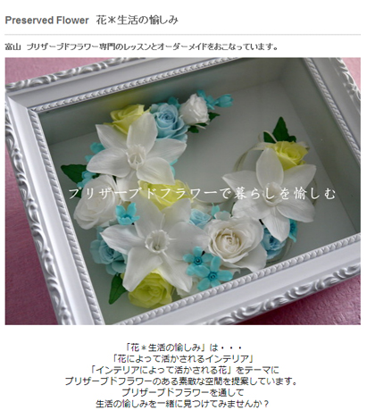 富山のプリザーブドフラワー専門の教室&アトリエです。「花によって活かされるインテリア」 「インテリアによって活かされる花」をテーマに プリザーブドフラワーのある素敵な空間を提案しています。