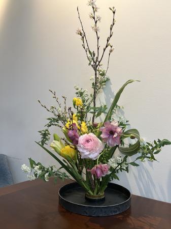 真ん中ぬヒヤシンスの球根。周りにお花を挿すだけ。今回のはちょっと細いフリージア。それなりに出来上がりました