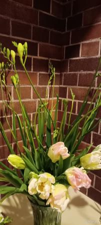 白いフリージアと、白色とピンク色のコンビネーションのチューリップを一緒に取り寄せてみました。