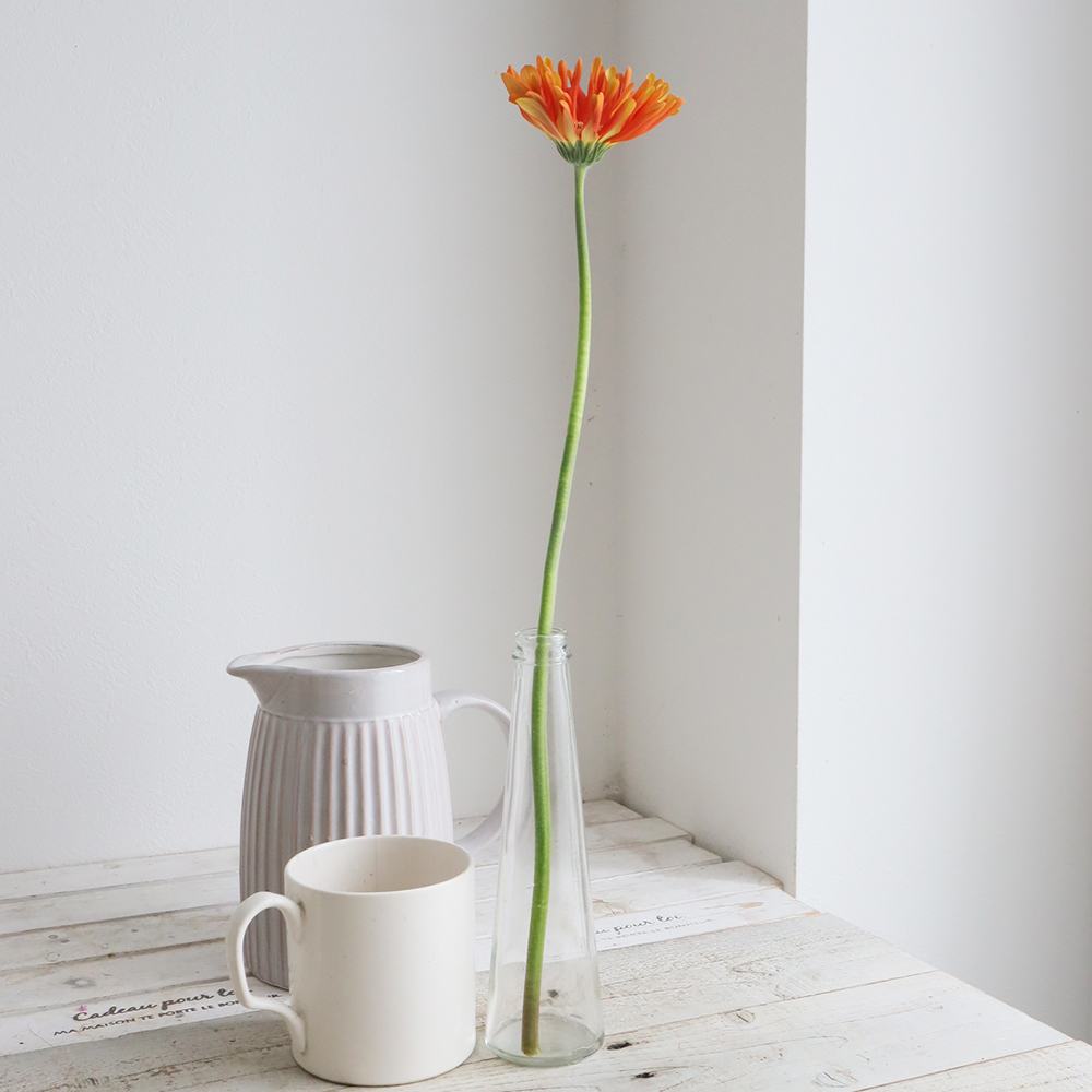 しかし、自然により近い状態でじっくりと根を張り花を咲かせたガーベラは、茎の硬さや花保ちの点で水耕栽培のものよりも優れます。