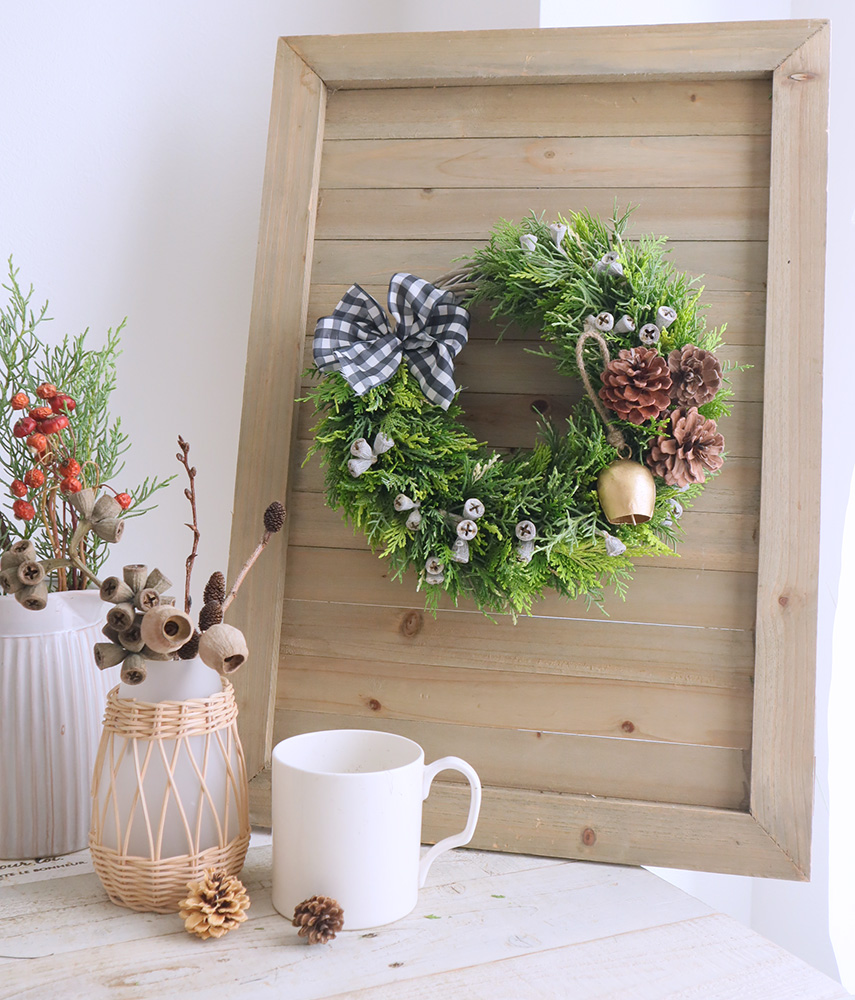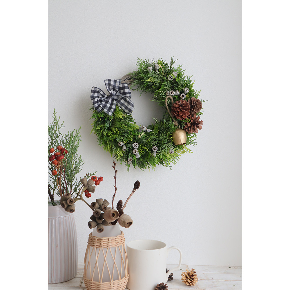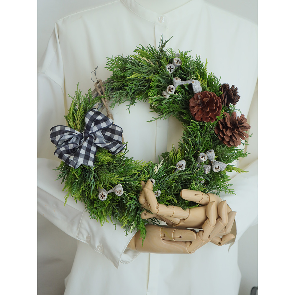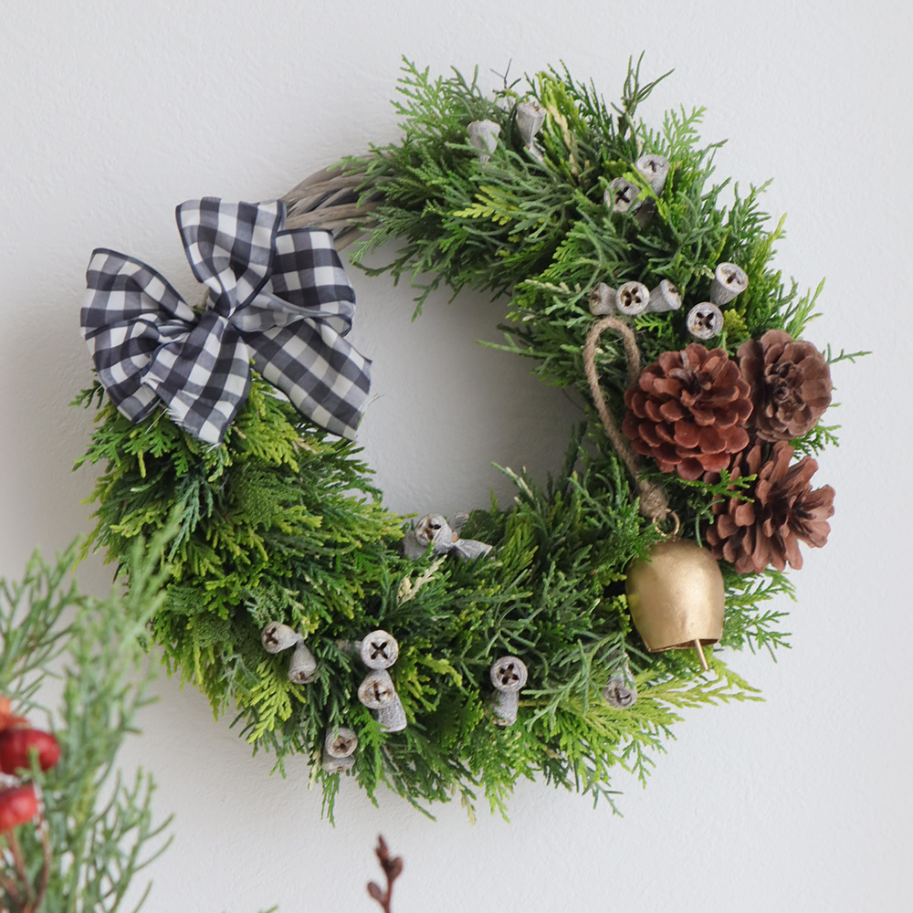 【生花】コニファーのカウベルリース(白黒チェック)/はなどんやキットなら花材通販【はなどんやアソシエ】におまかせ!即日発送、送料無料、ポイント還元も。個人法人問わず花材が仕入れられるネット通販です。