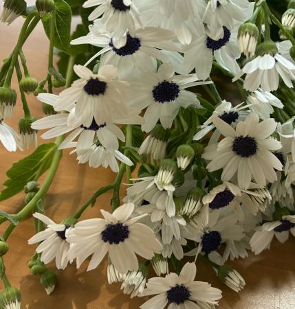 【08直前FJ】サイネリア(白)ティアスノーブルーアイ40cm程度【FJ】なら花材通販【はなどんやアソシエ】におまかせ!即日発送、送料無料、ポイント還元も。個人法人問わず花材が仕入れられるネット通販です。