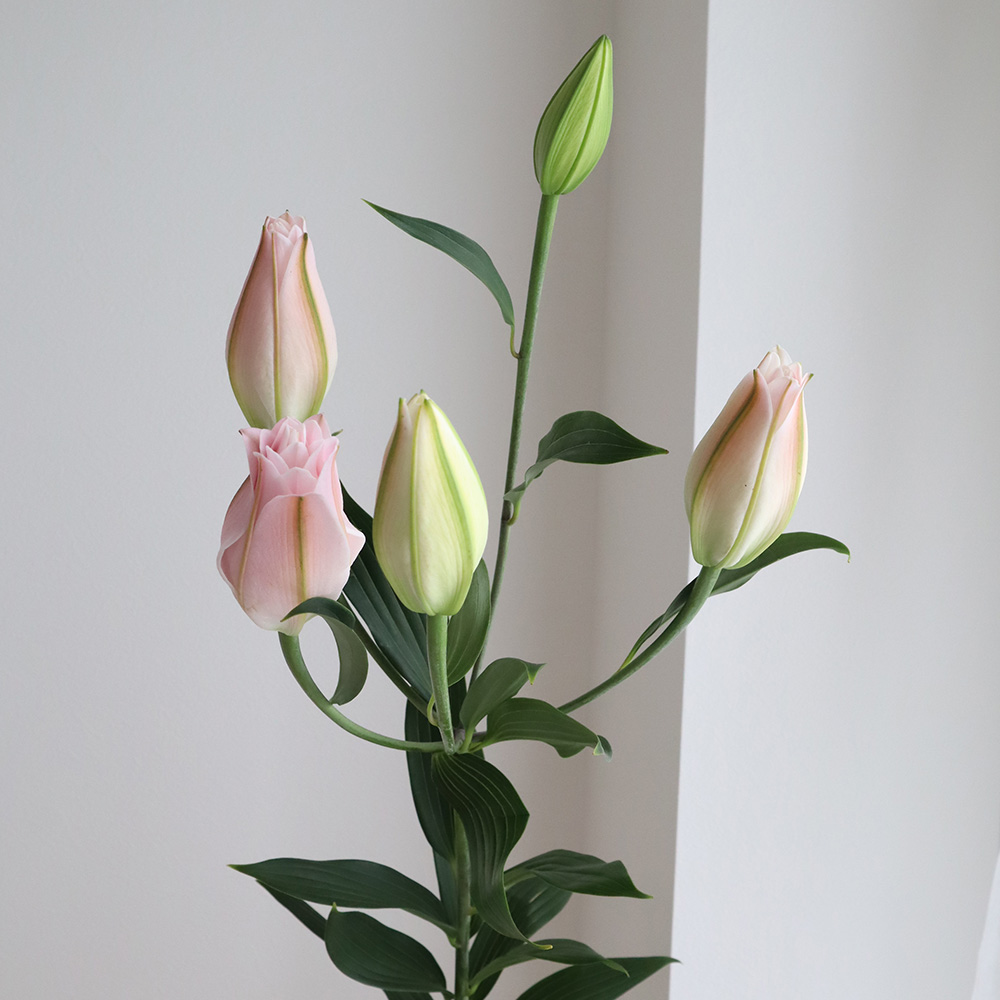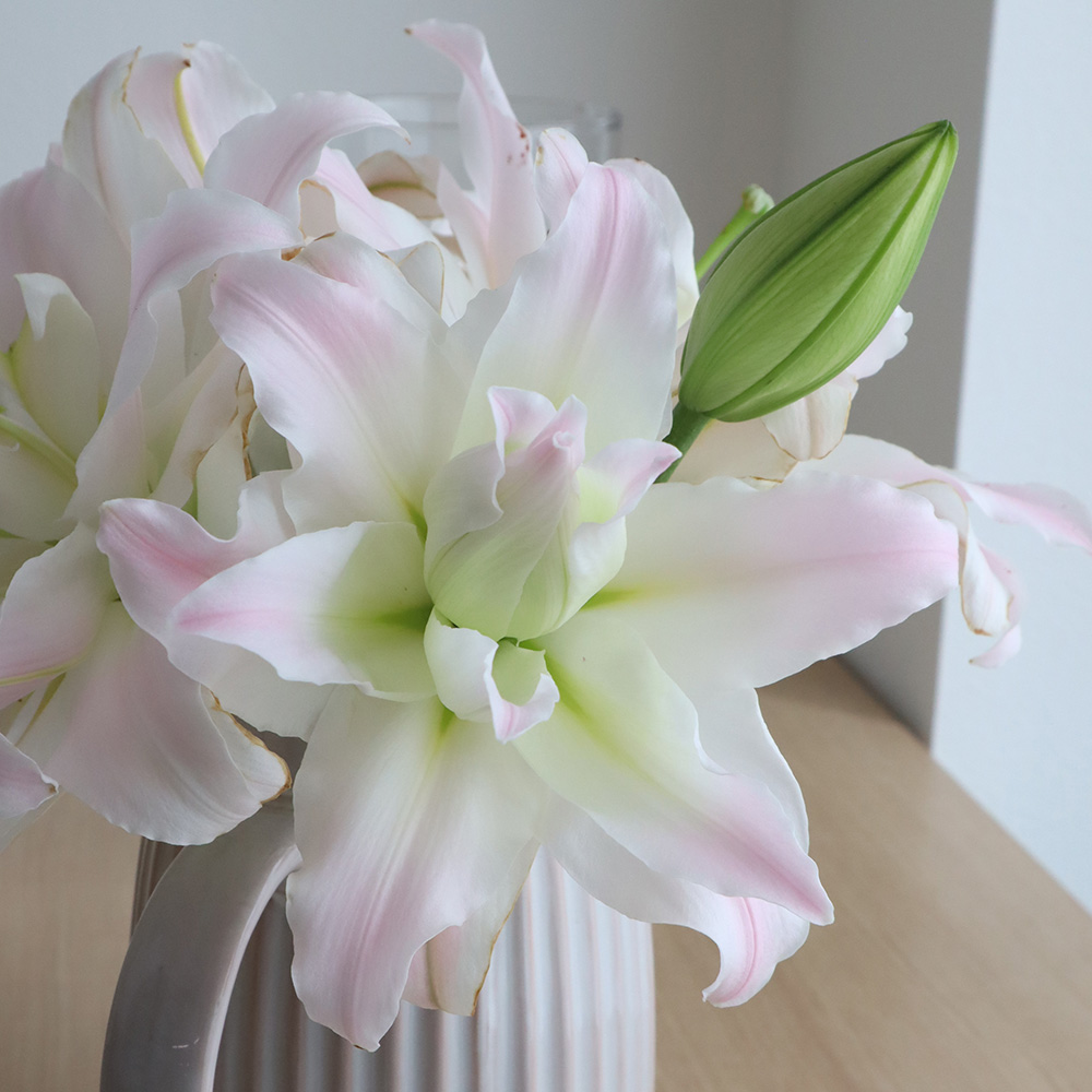【生花】オリエンタルユリ アミスタッド(ライトピンク八重)5-6輪 90CMFFヒライデ【OT】なら花材通販【はなどんやアソシエ】におまかせ!即日発送、送料無料、ポイント還元も。個人法人問わず花材が仕入れられるネット通販です。