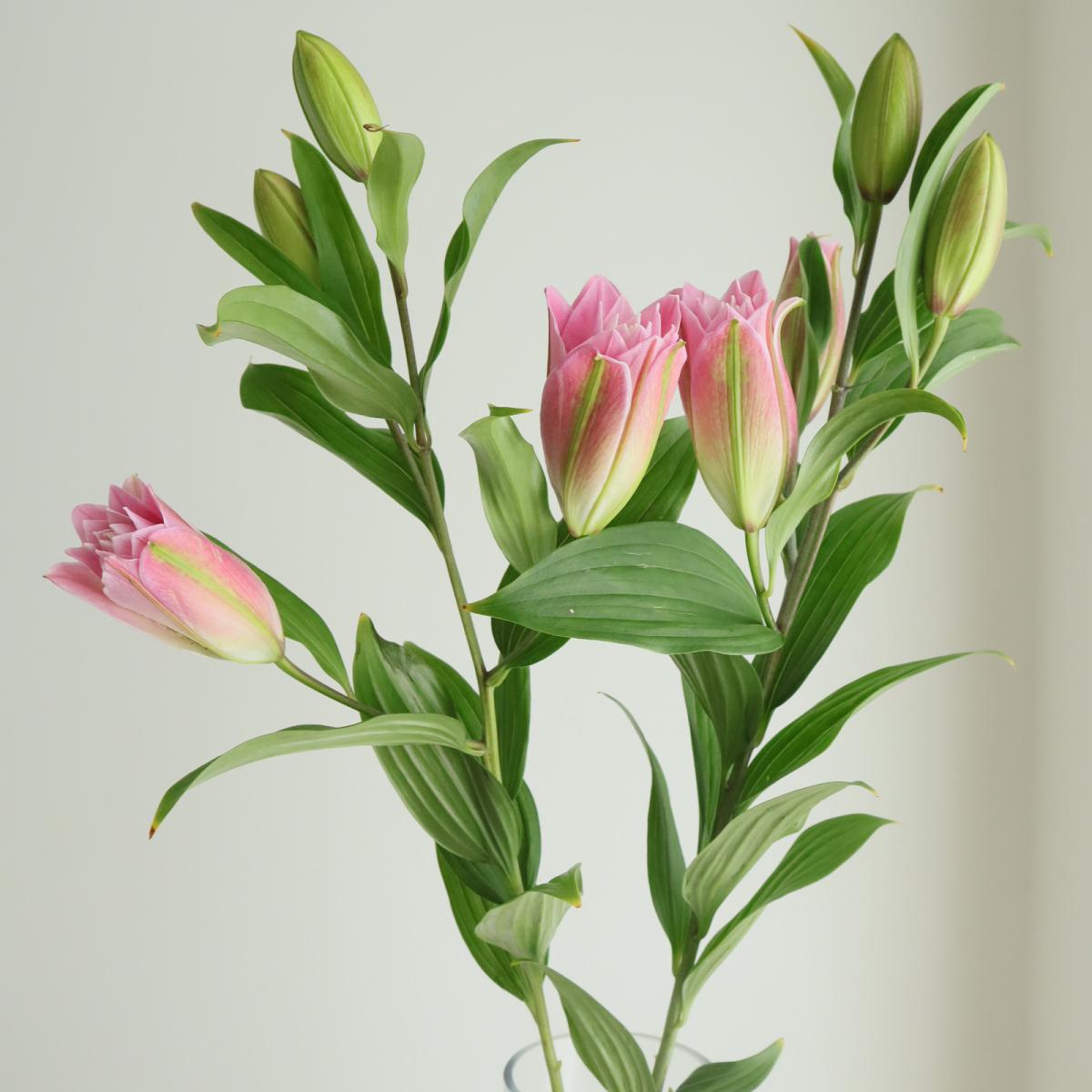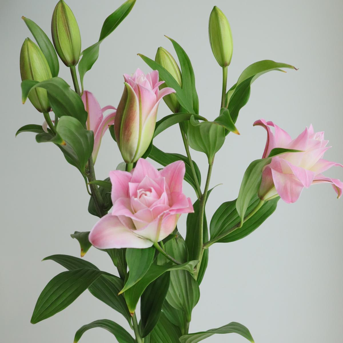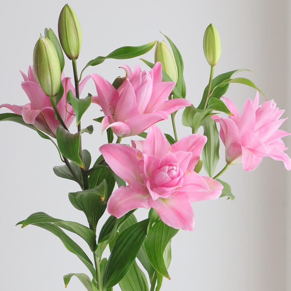 【生花】オリエンタルユリ ラッキーショット(ピンク八重)90cm 5-6輪 FFヒライデ【OT】なら花材通販【はなどんやアソシエ】におまかせ!即日発送、送料無料、ポイント還元も。個人法人問わず花材が仕入れられるネット通販です。