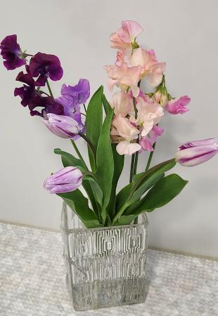 昨年、あとで買おうと延ばし延ばしにしていたら「今季販売終了」となり、チャンスを逃してしまったチューリップなので、今年は早めに購入しました(^_^;) 私は模様のついた個性派の花に惹かれがちなのですが、このチューリップは白い花びらにところどころ紫の筋が入るタイプで、思い描いていたより落ち着いた感じの花姿です。今回は同時購入のニゲラとあわせてみましたが、これならもっと主張の強い他の花々ともあわせられて、色んな組み合わせを楽しめるだろうなと思います。協調性のある扱いやすい花材、という印象ですね。ただ、今回うちに届いたものは、ずっと窄んだまま花びらを殆ど開かないので、上から中を覗いて見る楽しみが欠けていて、星を4つにしておきました。一週間以上経つ今も咲いているので、今からでも開いてくれるといいんですが……💦