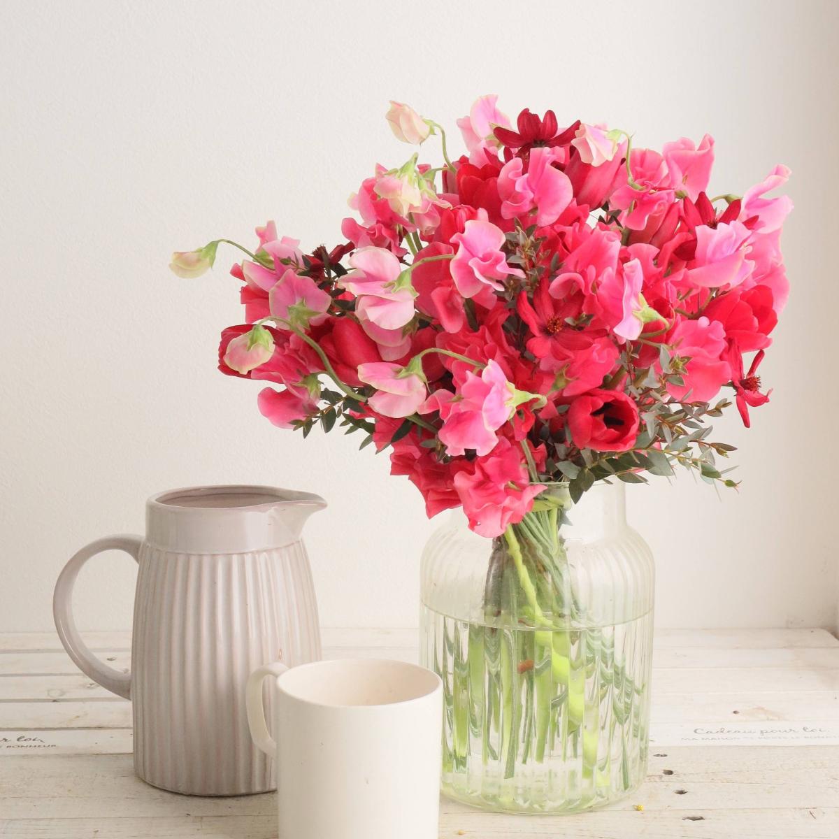 【生花】季節のフラワーセット:赤いスイトピーとチューリップの苺色ブーケ 【早締切】なら花材通販【はなどんやアソシエ】におまかせ!即日発送、送料無料、ポイント還元も。個人法人問わず花材が仕入れられるネット通販です。